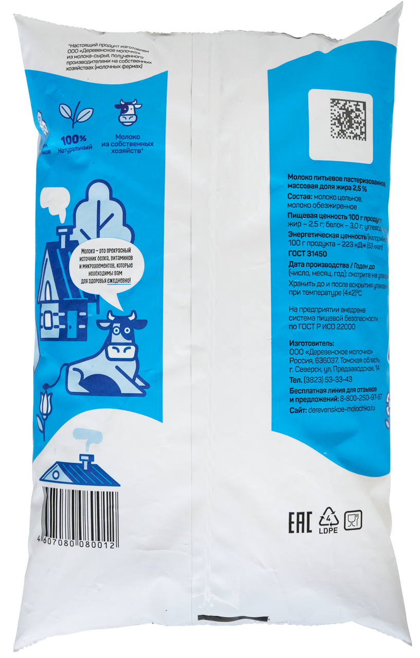 Молоко Деревенское молочко пастеризованное 2.5%, 900мл