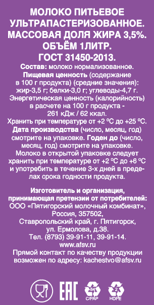 Молоко - один из главных источников микроэлементов для человека. Оно содержит кальций, фосфор, магний, натрий, железо, фтор, йод, а также витамины A, B1, B2, B12, C и D.На Пятигорском молочном комбинате применяется два вида обработки молока: пастеризация и ультрапастеризация. Эти технологии обеспечивают безопасность продукта, сохраняя при этом его полезные свойства. Несмотря на высокотемпературную обработку, молоко не становится стерильным, а сохраняет микроэлементы и полезные вещества. Основные изменения после обработки: - Уровень жирности остается прежним. - Снижение содержания витаминов - всего на 10%. - Количество молочного белка меняется незначительно. - Кальций и другие микроэлементы сохраняются полностью. - Патогенные микроорганизмы полностью уничтожаются. Это молоко не требует кипячения и хорошо взбивается, приобретая сладковатый вкус и образуя пенку, что делает его идеальным вариантом для добавления в капучино. За счет пастеризации и упаковки типа тетра пак продукт характеризуется большим сроком годности.