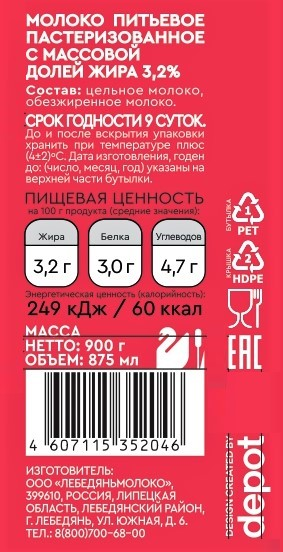 Молоко Лебедяньмолоко пастеризованное 3.2%, 900г