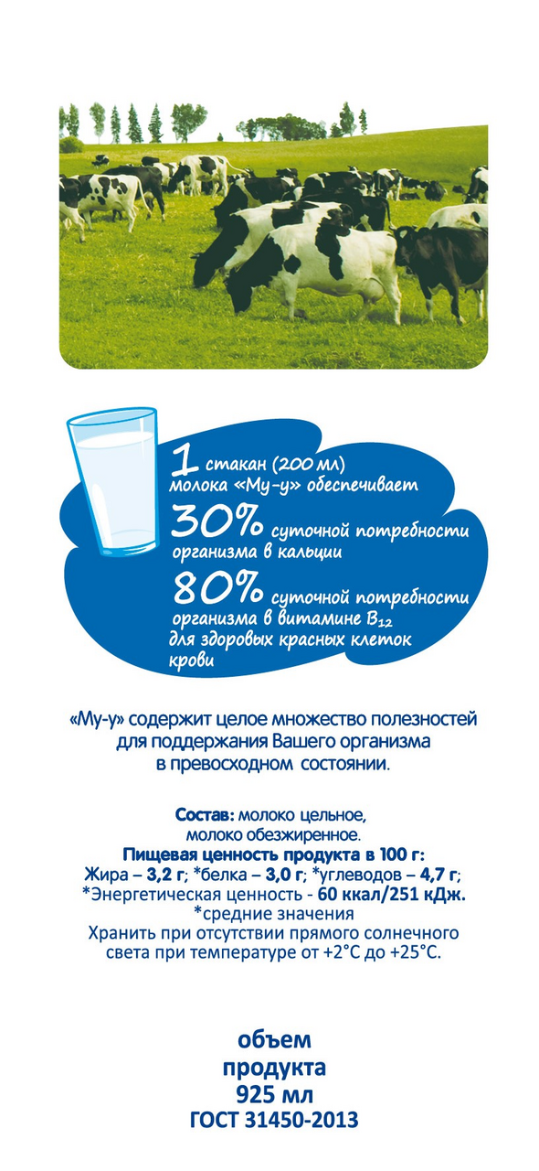 Молоко Му-у ультрапастеризованное 3.2%, 925мл