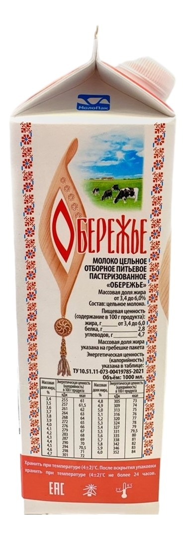 Молоко Обережье отборное пастеризованное 3.4-6%, 1л