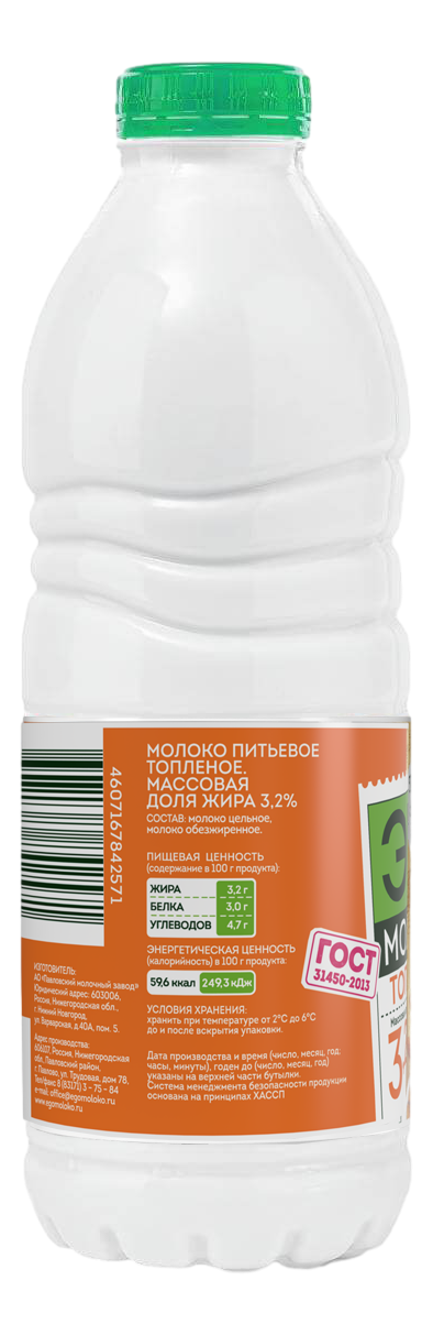 Натуральный продукт, изготовленный в соответствии с рецептурой ГОСТ из высококачественного коровьего молока путем бережного томления. Имеет красивый кремовый оттенок и приятный мягкий вкус с легкими карамельными нотками. Упаковано в пластиковую бутылку, надежно сохраняющую свежесть, органолептические свойства и питательную ценность в пределах всего срока годности. В составе нет растительных жиров, искусственных добавок, консервантов и ГМО. Отличается оригинальными вкусовыми свойствами и ароматом. Это молоко намного лучше усваивается организмом, чем обычное, поэтому многие люди используют в своем рационе именно топленое молоко.