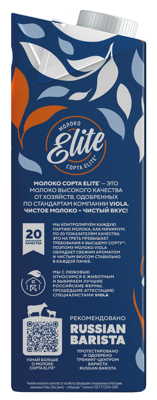 Молоко Viola UHT Отборное является первым молоком Viola с естественной жирностью, которая может варьироваться от 3,5 до 4,5% в зависимости от породы коров, погоды и прочих факторов. Это молоко бережно отбирается в лучших молочных хозяйствах, прошедших специальную аттестацию Viola. При его приготовлении мы сохранили всю пользу и питательную ценность живого молока: белки, жиры, углеводы, минеральные соли, витамины и микроэлементы. При этом Viola Отборное имеет насыщенный сливочный вкус и прекрасно подойдет как в качестве вкусного напитка, так и для приготовления любимых блюд — блинов, каши, выпечки. Молоко Отборное, как и вся продукция Viola, не содержит ГМО и антибиотиков.