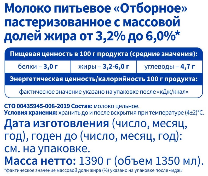 Молоко - натуральный, высокопитательный продукт, включающий все вещества, необходимые для полноценного питания организма. Вкус: слегка сладковатый, сливочный. Цвет: от белого до бледно-кремового. Натуральный продукт, с нежным естественный ароматом и насыщенным сладковатым молочный вкусом, без добавления сухого молока, красителей и консервантов. Питьевое молоко является источником множества питательных веществ и витаминов, богато кальцием, витаминами А, В12 и D, железом. Оно необыкновенно питательно и содержит полный набор полезных для жизни и роста человека веществ, доказано, что молочный белок лучше и легче усваивается организмом, чем белок мяса или рыбы. Можно использовать как самостоятельный напиток или готовить на его основе другие. Подходит для добавления в выпечку, основные блюда, соусы, коктейли.