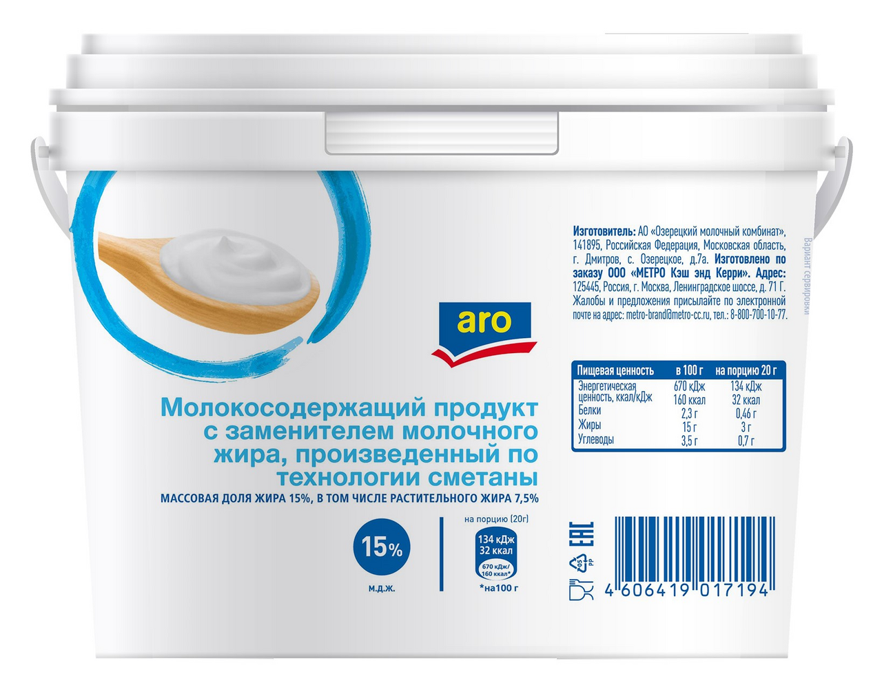 Молокосодержащий продукт aro расфасован в одноразовые емкости с крышкой. В холодильнике он сохраняет полезные свойства и вкусовые качества до 30 суток. Продукт станет хорошей альтернативой привычной сметане для тех, кто страдает от непереносимости молочной лактозы. В основе продукта – сухое молоко, а также растительные жиры. Вкус продукта приятный. Он полностью натуральный, сливочно-сладкий, поскольку заквашивание осуществляется с использованием бактерий. Молокосодержащий продукт станет достойной гастрономической добавкой к горячим блюдам, таким как пельмени, вареники, сырники, оладьи, блины и супы. Также ее можно использовать для тушения, приготовления соусов, кремов, а также создания теста для выпечки. Кроме того, сметана может употребляться в качестве полноценного перекуса в сочетании с фруктовыми и ягодными добавками.