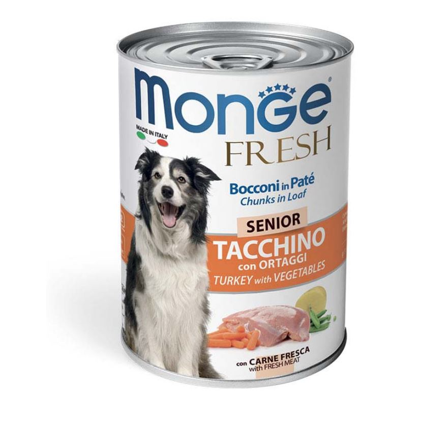 Консервы Monge Fresh Мясной рулет для пожилых собак индейка с овощами, 400г