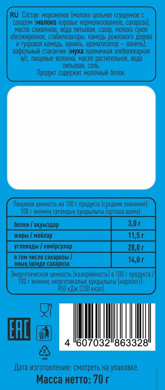 Молоко цельное сгущенное с сахаром молоко коровье нормализованное, сахарный сироп, масло сливочное, молоко сухое обезжиренное, вода питьевая, сахар, стабилизаторы: камеди рожкового и гуарового дерева, ароматизатор - ванилин; Стаканчик: мука пшеничная хлебопекарная, крахмал картофельный, масло растительное, соль.