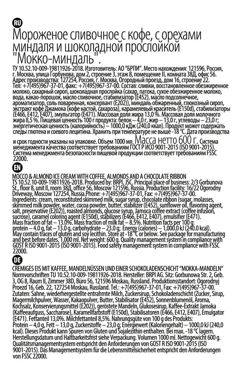 Мороженое сливочное Brandice Мокко и миндаль, 600г