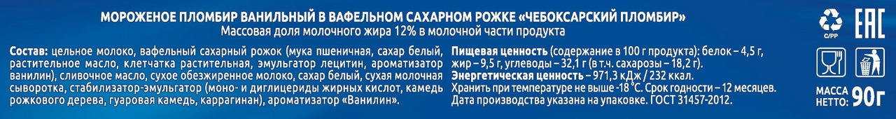 Мороженое пломбир Чебоксарский пломбир Ванильное в вафельном рожке ГОСТ, 90г