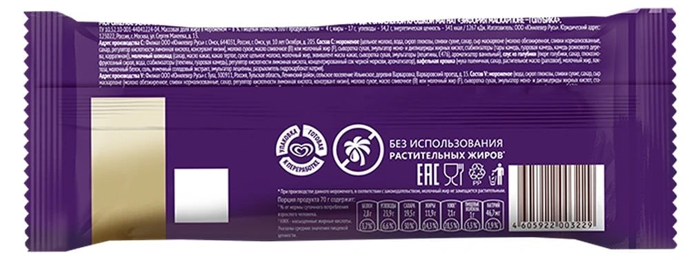 Мороженое (вода, глюкозный сироп, сливки сухие, сахар, сыр маскарпоне (молоко обезжиренное, сливки нормализованные, сахар, регулятор кислотности лимонная кислота), молоко сухое, масло сливочное (B) или молочный жир (F), сыворотка сухая, эмульгатор моно- и диглицериды жирных кислот, стабилизаторы (тары камедь, гуаровая камедь, камедь рожкового дерева, каррагинан)), молочный шоколад (сахар, масло какао, какао тертое, сухое цельное молоко, молочный жир, эквивалент масла какао, сыворотка сухая, эмульгаторы (лецитины, Е476), ароматизатор ванильный), соус из голубики (пюре голубики, сахар, глюкозно-фруктозный сироп, вода, стабилизаторы (пектины, гуаровая камедь), регулятор кислотности лимонная кислота, концентрированный сок черной моркови, ароматизатор), вафельная крошка (мука пшеничная, сахар, растительные масла (рапсовое), молочный жир, лактоза, молочный белок, соль, ячменный солодовый экстракт, эмульгатор лецитины, разрыхлитель гидрокарбонат натрия).
