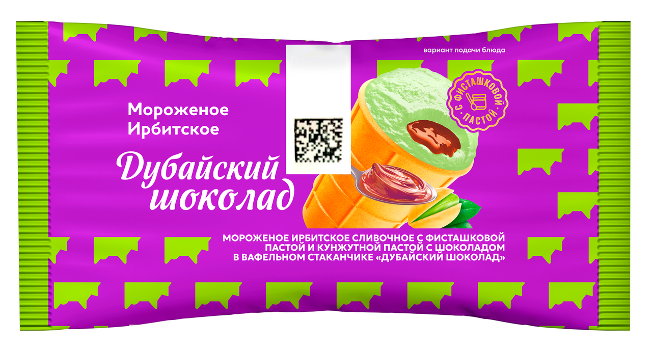 Вкусное сочетание по мотивам Дубайского шоколада. Фисташковое мороженое на основе сливочного мороженого с добавлением натуральной фисташковой пасты и шоколадного топпинга с тахини. Аппетитный продукт в хрустящем вафельном рожке. Лакомство с нежной текстурой и хорошо сбалансированным вкусом медленно тает во рту, приятно освежает и оставляет яркое послевкусие.
