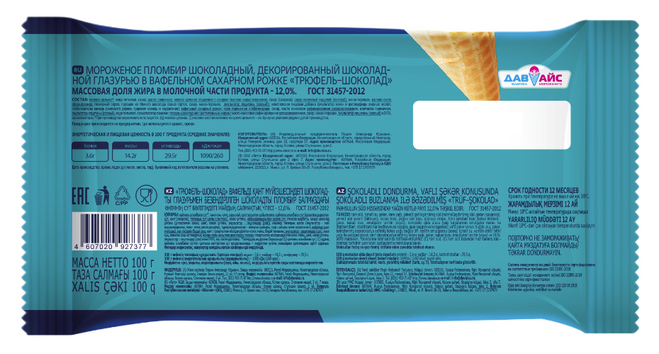 Молоко цельное, вода питьевая, сахар, масло сливочное, молоко цельное сгущенное с сахаром (молоко нормализованное, сахар (сахароза), сахар молочный пищевой (лактоза)), какао-порошок, молоко сухое обезжиренное, глюкозный сироп, порошок из темного шоколада (какао тертое, сахар, какао-порошок, эмульгатор лецитины (соевый)), комплексная пищевая добавка (эмульгатор моно- и диглицериды жирных кислот, стабилизаторы камедь рожкового дерева, гуаровая камедь и каррагинан); вафельный сахарный рожок: мука пшеничная хлебопекарная, сахар, масло кокосовое рафинированное дезодорированное, клетчатка пшеничная, эмульгатор лецитины (соевый), вода питьевая, ароматизатор ванилин; глазурь шоколадная с растительным жиром: масло кокосовое рафинированное дезодорированное, сахар, какао-порошок, эмульгаторы лецитины (соевый) и Е476, ароматизаторы.
