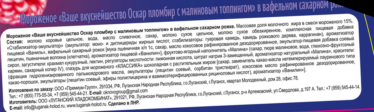 Молоко коровье цельное, вода, масло сливочное, сахар, молоко сухое цельное, молоко сухое обезжиренное, комплексная пищевая добавка Стабилизатор-эмульгатор (эмульгатор: моно- и диглицериды жирных кислот, стабилизаторы: гуаровая камедь, камедь рожкового дерева, каррагинан), ароматизатор пищевой Ваниль, вафельный сахарный рожок (мука пшеничная хлебопекарная 1с, сахар, масло кокосовое рафинированное дезодорированное, эмульгатор-пищевая добавка соевый лецитин, пшеничные волокна (клетчатка), ароматизатор пищевой Ванилин), фруктово-ягодный наполнитель Малина (сахар, пюре малиновое, вода, глюкозно-фруктозный сироп, загустители: крахмал кукурузный, пектин, регуляторы кислотности: лимонная кислота, цитрат натрия 3-замещенный, ароматизатор натуральный Малина, красители: кармин, сахарный колер ІV), глазурь для мороженого Классика шоколадная с растительным жиром (сахар, заменитель какао-масла нетемперируемый лауринового типа (фракция гидрогенизированного пальмоядрового масла, эмульгаторы (лецитин соевый, сорбитан тристеарат), кокосовое масло рафинированное дезодорированное, какао-порошок, эмульгаторы (лецитин соевый, эфиры полиглицерина и взаимоэтерифицированных рициноловых кислот), ароматизатор Ванилин).