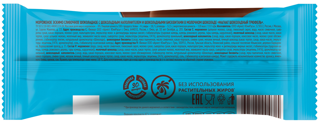 Магнат Шоколадный трюфель - это утонченный десерт, сочетание шоколадного мороженого и молочного шоколада. Насыщенный вкус дополняют легкие бисквиты и шоколадный соус - они создают незабываемые впечатления от знакомства с мороженым. Магнат Шоколадный трюфель вдохновляет своей изысканностью и дарит истинное шоколадное удовольствие. Это эскимо с молочной шоколадной глазурью и шоколадной начинкой. Внутри есть бисквитные крошки, которые придают хрустящую текстуру.