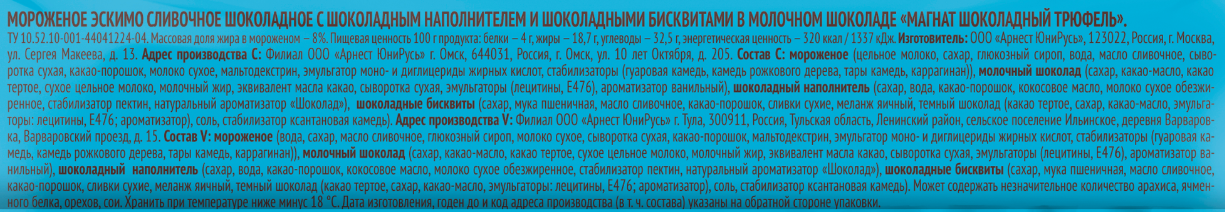 Мороженое цельное молоко, сахар, глюкозный сироп, вода, масло сливочное, сыворотка сухая, какао-порошок, молоко сухое, мальтодекстрин, эмульгатор моно - и диглицериды жирных кислот, стабилизаторы гуаровая камедь, камедь рожкового дерева, тары камедь, каррагинан, молочный шоколад сахар, какао-масло, какао тёртое, сухое цельное молоко, молочный жир, эквивалент масла какао, сыворотка сухая, эмульгаторы лецитины, Е476, ароматизатор ванильный, шоколадный наполнитель сахар, вода, какао-порошок, кокосовое масло, молоко сухое обезжиренное, стабилизатор пектин, натуральный ароматизатор Шоколад, шоколадные бисквиты сахар, мука пшеничная, масло сливочное, какао-порошок, сливки сухие, меланж яичный, тёмный шоколад какао тёртое, сахар, какао-масло, эмульгаторы: лецитины, Е476; ароматизатор, соль, стабилизатор ксантановая камедь; мороженое вода, сахар, масло сливочное, глюкозный сироп, молоко сухое, сыворотка сухая, какао-порошок, мальтодекстрин, эмульгатор моно - и диглицериды жирных кислот, стабилизаторы гуаровая камедь, камедь рожкового дерева, тары камедь, каррагинан, молочный шоколад сахар, какао-масло, какао тёртое, сухое цельное молоко, молочный жир, эквивалент масла какао, сыворотка сухая, эмульгаторы лецитины, Е476, ароматизатор ванильный, шоколадный наполнитель сахар, вода, какао-порошок, кокосовое масло, молоко сухое обезжиренное, стабилизатор пектин, натуральный ароматизатор Шоколад, шоколадные бисквиты сахар, мука пшеничная, масло сливочное, какао-порошок, сливки сухие, меланж яичный, тёмный шоколад какао тёртое, сахар, какао-масло, эмульгаторы: лецитины, Е476; ароматизатор, соль, стабилизатор ксантановая камедь.
