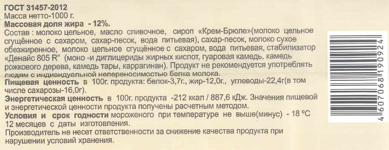 Молоко цельное, масло сливочное, сироп Крем-Брюле молоко цельное сгущённое с сахаром, сахар, вода питьевая, сахар, молоко сухое обезжиренное, молоко цельное сгущённое с сахаром, вода питьевая, стабилизатор Денайс 855R моно - и диглицериды жирных кислот Е471, гуаровая камедь Е412, камедь рожкового дерева Е410, камедь тары Е417, каррагинан Е407.