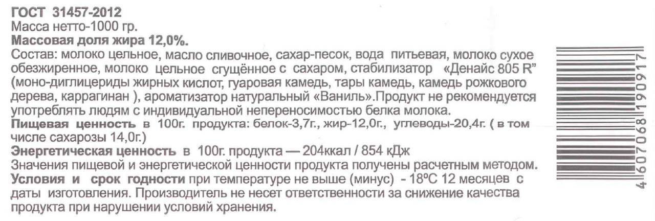 Молоко цельное, масло сливочное, сахар, вода питьевая, молоко сухое обезжиренное, молоко цельное сгущённое с сахаром, стабилизатор Денайс 855 моно - и диглицериды жирных кислот Е471, гуаровая камедь Е412, камедь рожкового дерева Е410, камедь тары Е417, каррагинан Е407, ароматизатор пищевой Ванилин DEL'AR 555 сахар, вкусоароматические вещества, агент антислеживающий Е551.