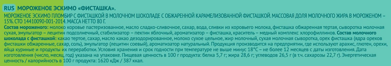 Молоко коровье пастеризованное, масло сладко-сливочное, сахар, вода, сливки из коровьего молока, фисташка обжаренная тертая, сыворотка молочная сухая, эмульгатор - лецитин подсолнечный, стабилизатор-пектин яблочный, ароматизатор – фисташка, краситель – медный комплекс хлорофиллинов; молочный шоколад с фисташкой: какао тертое, сахар, масло какао дезодорированное, молоко сухое цельное, жир молочный, сухая молочная сыворотка, орех фисташка (ядро орехов фисташки обжаренные, сахар, соль), эмульгатор (лецитин соевый), ароматизатор натуральный.
