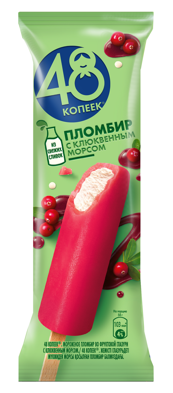 Мороженое пломбир 48 копеек во фруктовой глазури с клюквенным морсом эскимо 12%, 61г