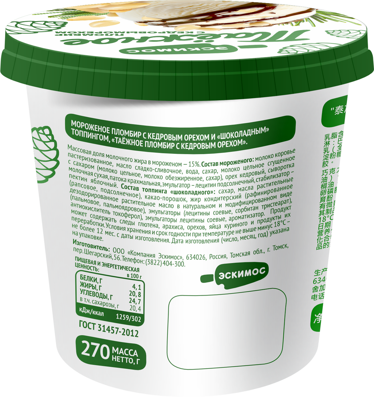 Молоко коровье пастеризованное, масло сладко – сливочное, вода, сахар, молоко цельное сгущённое с сахаром молоко цельное, молоко обезжиренное, сахар, орех кедровый, сыворотка молочная сухая, патока крахмальная, эмульгатор - лецитин подсолнечный, стабилизатор-пектин яблочный; Топпинг шоколадный: сахар, масла растительные рапсовое, подсолнечное, какао-порошок, жир кондитерский рафинированное дезодорированное растительное масло в натуральном и модифицированном виде пальмовое, пальмоядровое, эмульгаторы лецитины соевые, сорбитан тристеарат, антиокислитель токоферол, эмульгаторы лецитины соевые, ароматизатор.