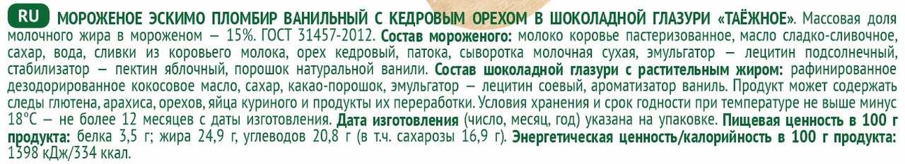 Молоко коровье пастеризованное, масло сладко - сливочное, сахар, вода, сливки из коровьего молока, орех кедровый, патока, сыворотка молочная сухая, эмульгатор – лецитин подсолнечный, стабилизатор – пектин яблочный, порошок натуральной ванили; шоколадная глазурь с растительным жиром: рафинированное дезодорированное кокосовое масло, сахар, какао-порошок, эмульгатор – лецитин соевый, ароматизатор ваниль.