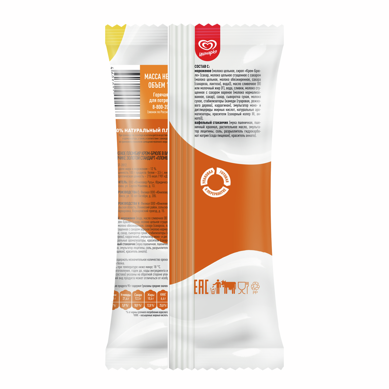 Мороженое (молоко цельное, сироп крем-брюле (сахар, молоко цельное сгущенное с сахаром (молоко цельное, молоко обезжиренное, сахара (сахароза, лактоза), вода)), масло сливочное (B) или молочный жир (F), вода, сливки, молоко сгущенное с сахаром вареное (молоко нормализованное, сахар), сахар, сыворотка сухая, молоко сухое, стабилизаторы (камеди (гуаровая, рожкового дерева), каррагинан), эмульгатор моно- и диглицериды жирных кислот, натуральные ароматизаторы, красители (сахарный колер III, аннато)), вафельный стаканчик (мука пшеничная, пшеничный крахмал, растительное масло, эмульгатор лецитины, соль, разрыхлитель гидрокарбонат натрия (сода пищевая), краситель аннато).