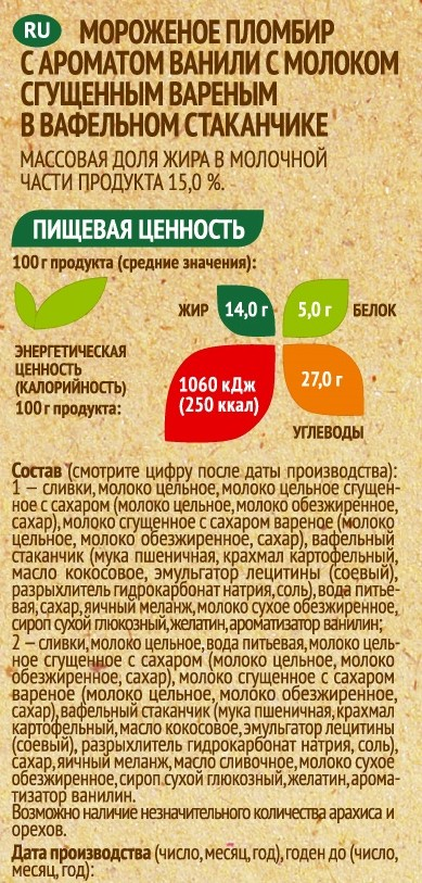 Состав 1: сливки, молоко цельное, молоко цельное сгущённое с сахаром молоко цельное, молоко обезжиренное, сахар, молоко сгущённое с сахаром варёное молоко цельное, молоко обезжиренное, сахар, вафельный стаканчик мука пшеничная, крахмал картофельный, масло кокосовое, эмульгатор лецитины соевый, разрыхлитель гидрокарбонат натрия, соль, вода питьевая, сахар, яичный меланж, молоко сухое обезжиренное, сироп сухой глюкозный, желатин, ароматизатор ванилин; Состав 2: сливки, молоко цельное, вода питьевая, молоко цельное сгущённое с сахаром молоко цельное, молоко обезжиренное, сахар, молоко сгущённое с сахаром варёное молоко цельное, молоко обезжиренное, сахар, вафельный стаканчик мука пшеничная, крахмал картофельный, масло кокосовое, эмульгатор лецитины соевый, разрыхлитель гидрокарбонат натрия, соль, сахар, яичный меланж, масло сливочное, молоко сухое обезжиренное, сироп сухой глюкозный, желатин, ароматизатор ванилин.