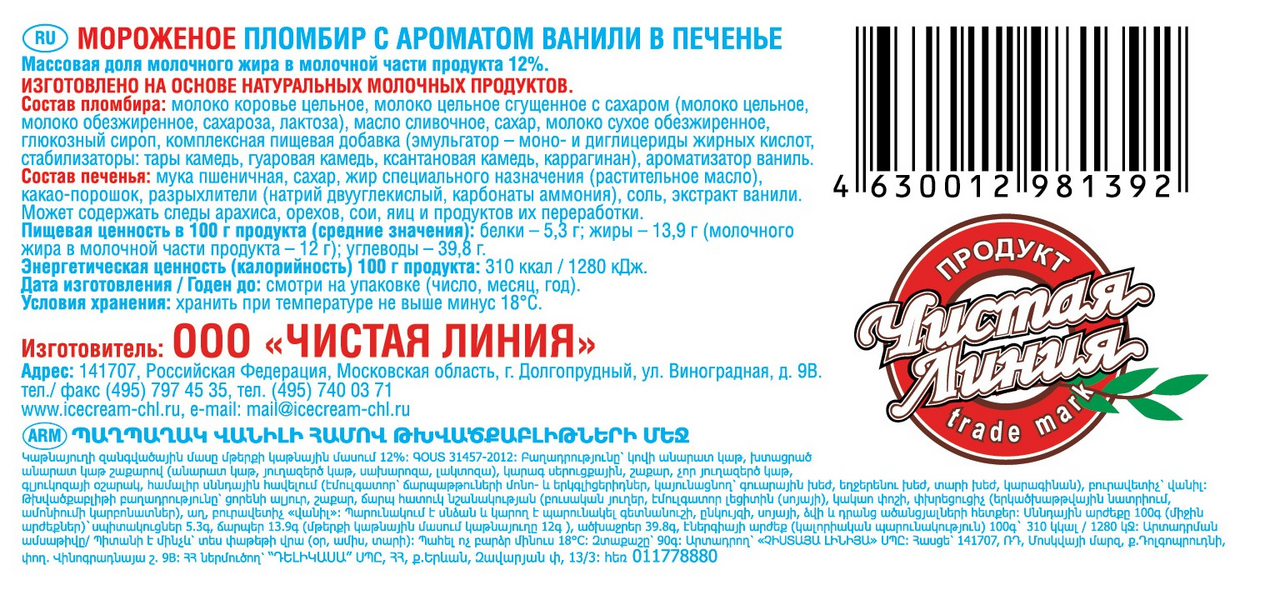 Ванильная нежность классического пломбира Чистая линия в вкуснейшем шоколадном печенье — идеальный десерт для ценителей необычных сочетаний и вкусов. Создан для тех, кто ищет для себя что-то новое. Лакомство порадует своим составом, в котором идеально сочетается свежее коровье молоко, сливки, сгущенка, сахар и глюкозный сироп. Никаких заменителей молочного жира и усилителей вкуса, Чистая линия тщательно отбирает каждый ингредиент для своих продуктов.Может содержать следы глютена и арахиса.