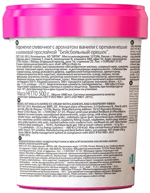 Произведено по ГОСТу, полностью из натуральных ингредиентов. Мороженое сливочное с ароматом ванили с орехами кешью и малиновой прослойкой Бейсбольной орешек.