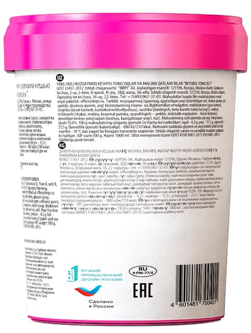 Сливки, восстановленное обезжиренное молоко, сахарный сироп, наполнитель малиновый (сахар, малина, вода, загуститель пектин, ароматизатор малина, регулятор кислотности лимонная кислота, пищевой краситель кармин), орехи кешью обжаренные (кешью, масло подсолнечное, соль поваренная пищевая), глюкозный сироп, стабилизаторы (е466, е412, е407), ароматизатор ваниль, пищевой краситель (е160а), эмульгатор (е471).