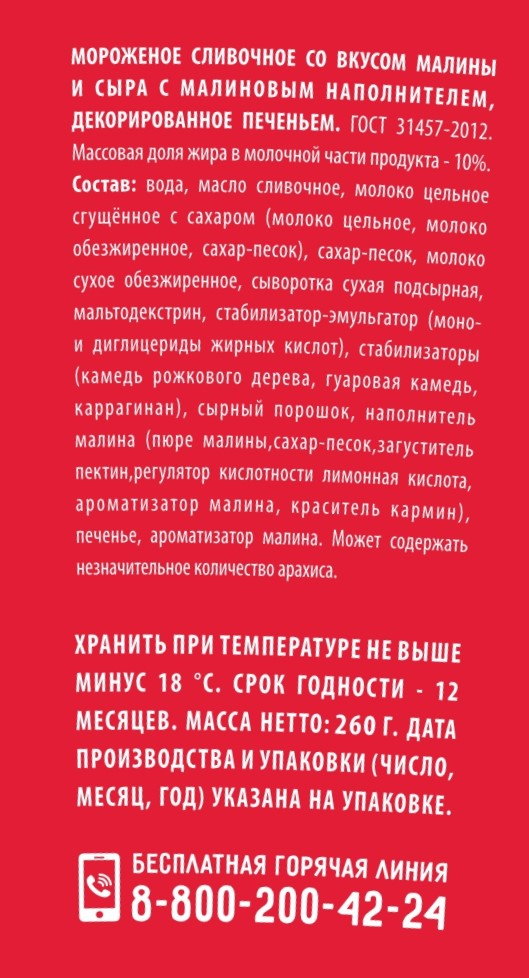 Вода, масло сливочное, молоко цельное сгущённое с сахаром, молоко цельное, молоко обезжиренное, сахар-песок, сахар-песок, молоко сухое обезжиренное, сыворотка сухая подсырная, мальтодекстрин, стабилизатор-эмульгатор моно- и диглицериды жирных кислот, стабилизаторы камедь рожкового дерева, гуаровая камедь, каррагинан, сырный порошок, наполнитель малина пюре малины, сахар-песок, загуститель пектин, регулятор кислотности лимонная кислота, ароматизатор малина, краситель кармин, печенье, ароматизатор малина.