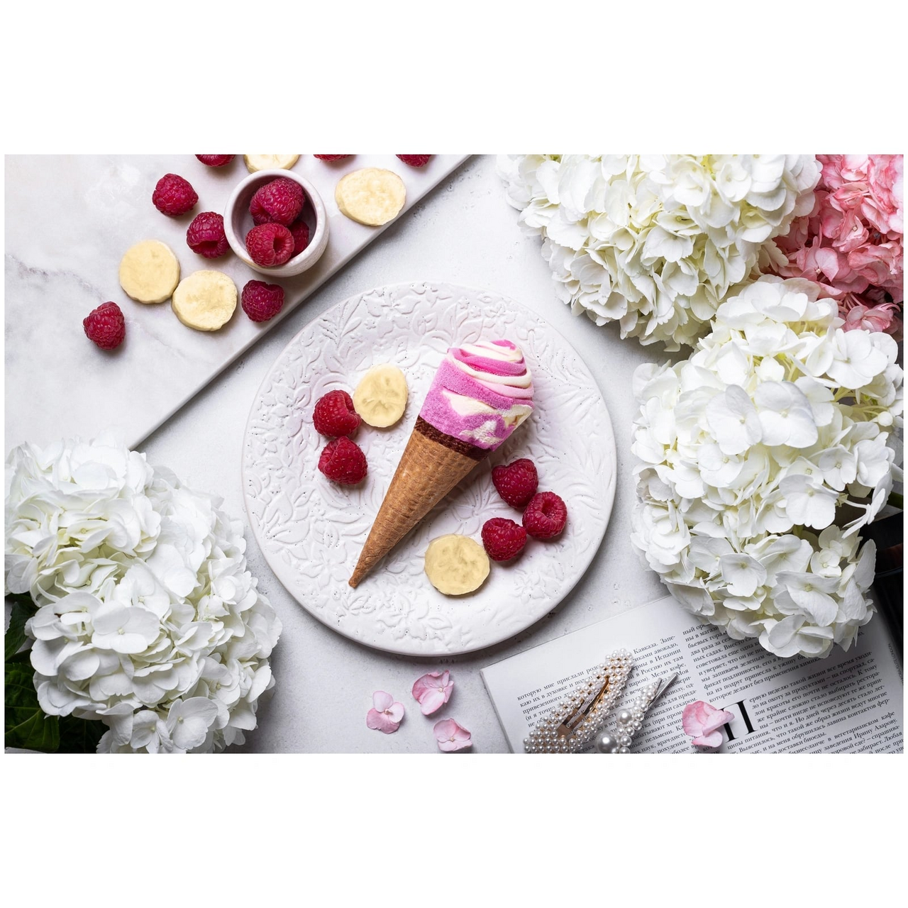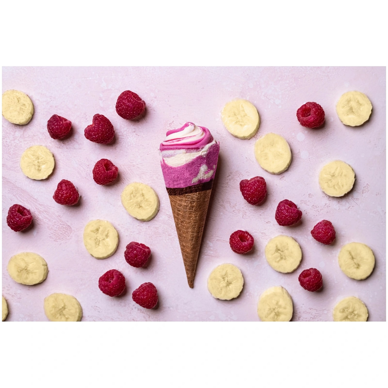 Не содержит растительных жиров. Нежная сливочная банановая масса соблазнительно сочетается с освежающим малиновым сорбетом с прослойками кисло-сладкого ягодного соуса. Вафельный рожок покрыт изнутри тонким слоем шоколадной глазури, что сохраняет его хрустящую структуру и делает кончик рожка особенно вкусным.