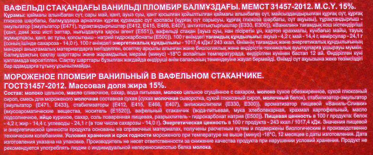 Молоко цельное, масло сливочное, сахар, вода питьевая, молоко цельное сгущённое с сахаром, молоко сухое обезжиренное, сухой глюкозный сироп, смесь для мороженого молочная составная сухая: сухая молочная сыворотка, сухой глюкозный сироп, молочный белок, стабилизатор - эмульгатор Е471, Е433, стабилизаторы Е412, Е415, Е466, Е407, антиокислители Е330, Е300, ароматизатор пищевой Ваниль-сливки вкусоароматические вещества, носитель Е1520, вафельный стаканчик вода-питьевая, мука хлебопекарная, крахмал картофельный, масло подсолнечное, яйцо куриное, сахар, соль поваренная пищевая, разрыхлитель - гидрокарбонат натрия Е500.