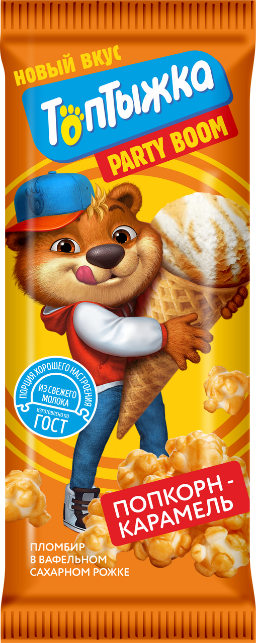 Мороженое пломбир Топтыжка Ванильное с попкорном и карамелью в вафельном рожке 12%, 60г
