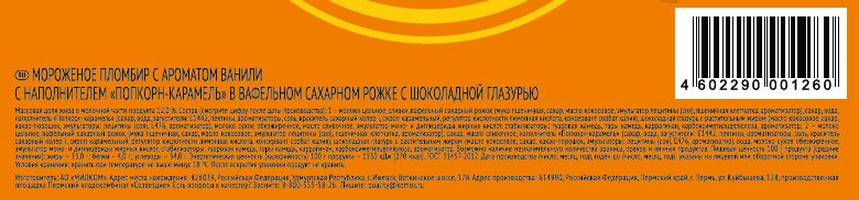 1 - молоко цельное, сливки, вафельный сахарный рожок (мука пшеничная, сахар, масло кокосовое, эмульгатор лецитины (соевый), пшеничная клетчатка, ароматизатор), сахар, вода питьевая, наполнитель Попкорн-карамель (сахар, вода, загустители: Е1442, пектины, ароматизаторы, соль, краситель сахарный колер I, сироп карамельный, регулятор кислотности лимонная кислота, консервант сорбат калия), шоколадная глазурь с растительным жиром (масло кокосовое, сахар, какао-порошок, эмульгаторы: лецитины (соевый), Е476, ароматизатор), молоко сухое обезжиренное, масло сливочное, эмульгатор моно- и диглицериды жирных кислот, стабилизаторы: гуаровая камедь, тары камедь, каррагинан, карбоксиметилцеллюлоза, ароматизатор (ваниль); 2 - молоко цельное, вафельный сахарный рожок (мука пшеничная, сахар, масло кокосовое, эмульгатор лецитины (соевый), пшеничная клетчатка, ароматизатор), сахар, масло сливочное, наполнитель Попкорн-карамель (сахар, вода, загустители: Е1442, пектины, ароматизаторы, соль, краситель сахарный колер I, сироп карамельный, регулятор кислотности лимонная кислота, консервант сорбат калия), шоколадная глазурь с растительным жиром (масло кокосовое, сахар, какао-порошок, эмульгаторы: лецитины (соевый), Е476, ароматизатор), вода питьевая, молоко сухое обезжиренное, эмульгатор моно- и диглицериды жирных кислот, стабилизаторы: гуаровая камедь, тары камедь, каррагинан, карбоксиметилцеллюлоза, ароматизатор (ваниль).