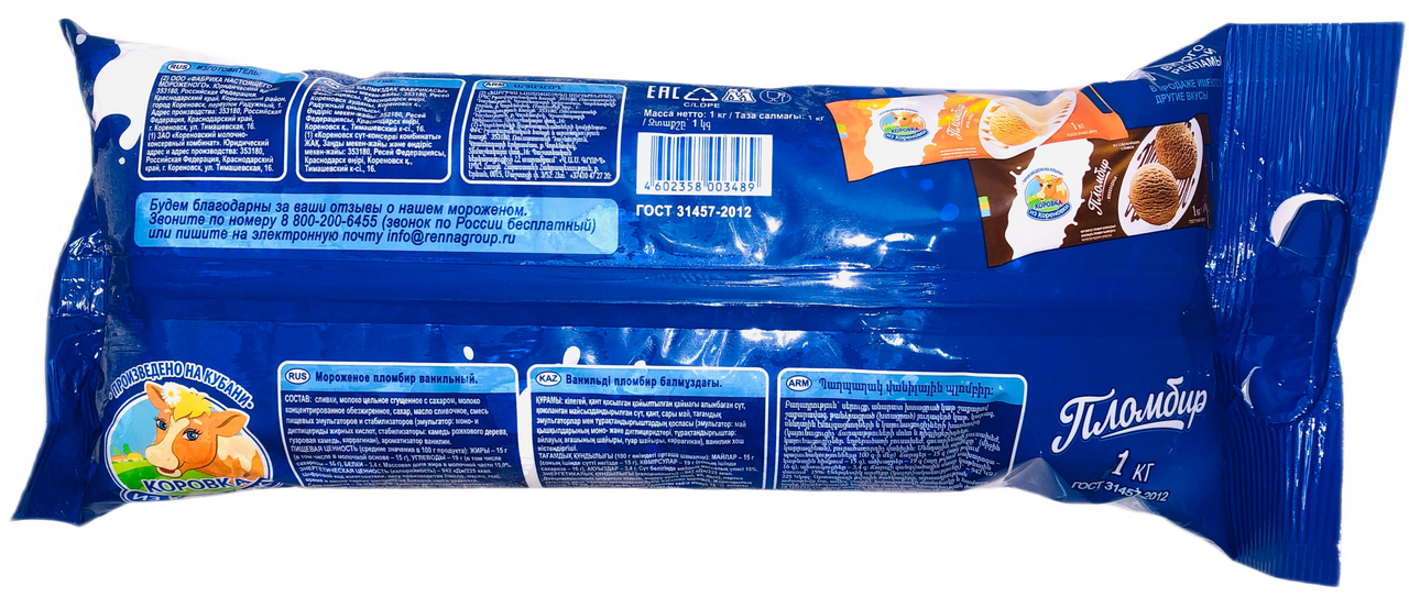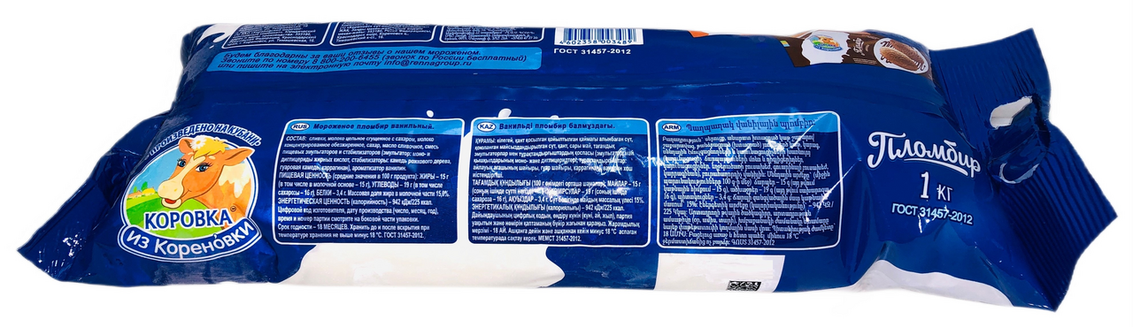 Мороженое Коровка из Кореновки Пломбир 15%, 1кг не оставит равнодушным ни детей, ни взрослых. Оригинальный ванильный вкус, нежная консистенция и оптимальная жирность – это лакомство способно заменить собой любой десерт, а малыши попросят добавки! Жарким летом пломбир приятно охлаждает, а если вам захочется разнообразить меню или порадовать маленьких непосед, просто приготовьте на основе мороженого невероятно вкусный коктейль с нежным вкусом сладкой ванили и тонким ароматом. Коровка из Кореновки - это натуральные молочные продукты без использования сухого молока, консервантов и технологии стерилизации. Именно поэтому они отличаются небольшим сроком годности и по праву называются живыми продуктами. Наше молоко, кефир, ряженка, творог, масло, сгущенное молоко выпускаются строго по ГОСТу. Это настоящие молочные продукты гарантированного качества. С Коровкой из Кореновки жить легко, она самая родная, добрая и душевная коровка. И про любой продукт марки Коровка из Кореновки можно сказать, что он душевный. Коровка из Кореновки - душевные молочные продукты.
