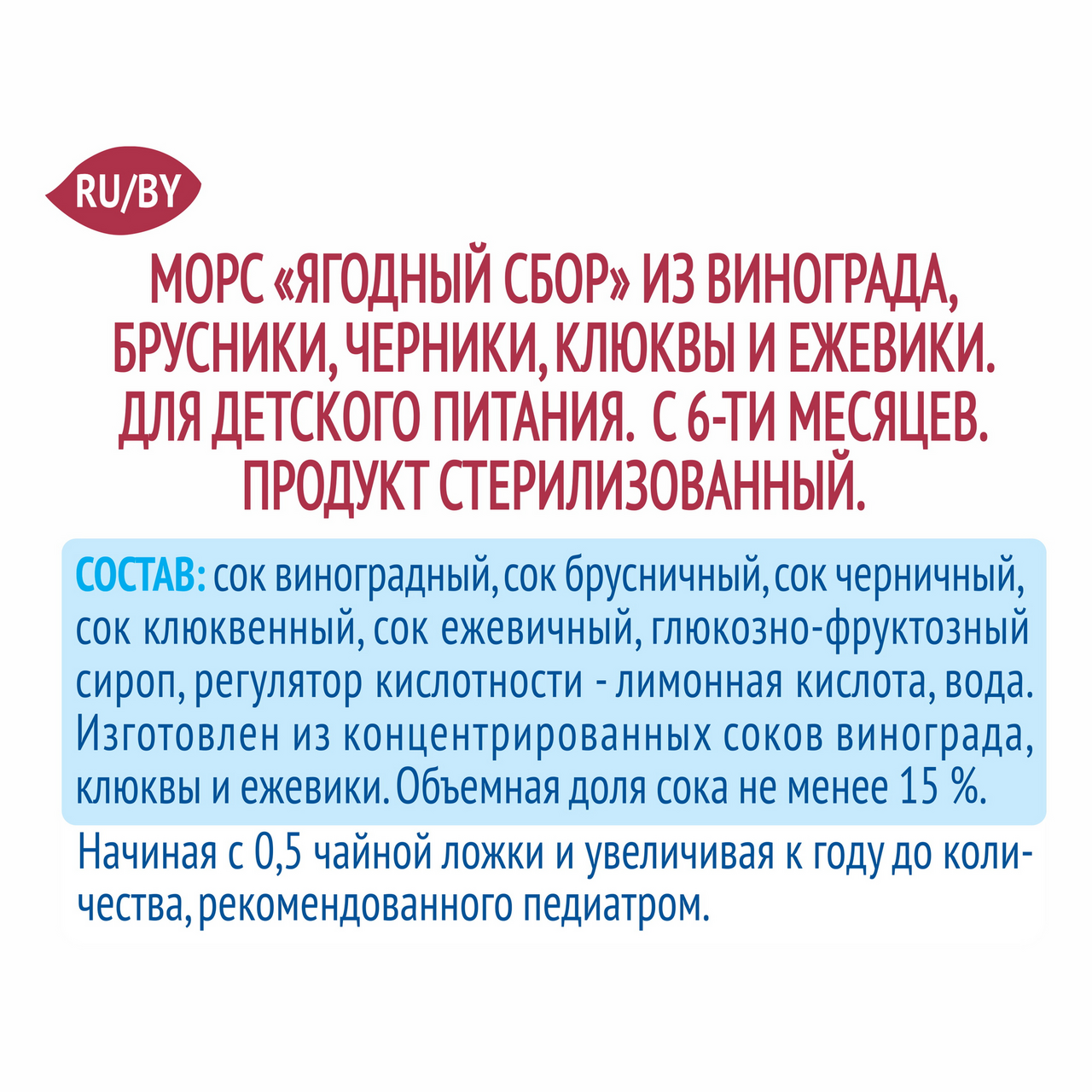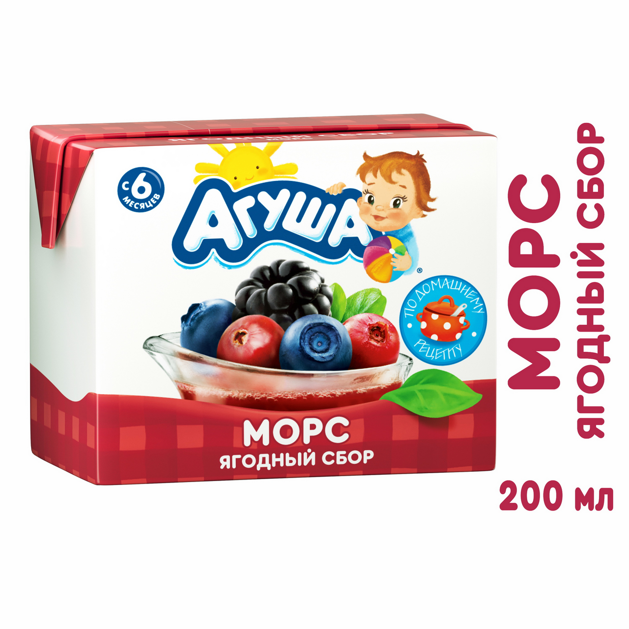 Детям с 6 месяцев Морс Агуша Ягодный сбор с 6 мес. 200 мл. Морс приготовлен по традиционной технологии и не содержит красителей и консервантов. Ягоды, входящие в состав морса, содержат набор необходимых ребенку микроэлементов и макроэлементов. Брусника положительно влияет на работу почек и кишечника. Черника оказывает общеукрепляющее действие, нормализует процесс пищеварения, повышает остроту зрения. Ежевика и клюква богаты многочисленными витаминами. Виноградный сок предупреждает развитие малокровия и рахита. Благотворно влияет на такие внутренние органы, как почки и печень, очищает их от токсинов. По домашнему рецепту. Без добавления сахара. Содержит сахара природного (естественного) происхождения. Без консервантов, красителей и ГМО. Способ употребления: Рекомендуется начинать с 0,5 чайной ложки, постепенно увеличивая к 12 месяцам до 100 г в день.