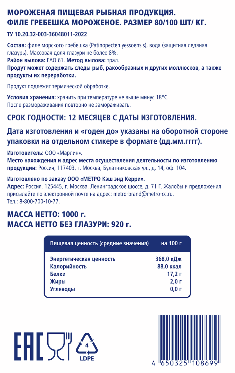 METRO Chef Морской гребешок Филе 80/100 замороженный это морской продукт, из которого можно приготовить много интересных праздничных и повседневных блюд. Его добавляют с закуски, салаты, тушат, маринуют, запекают, готовят на гриле. Замороженные гребешки необходимо хранить при температуре не выше -18С. Чтобы филе сохранило свою структуру и вкус, его разморозку следует проводить в основной камере холодильника, а перед приготовлением промыть в холодной воде.