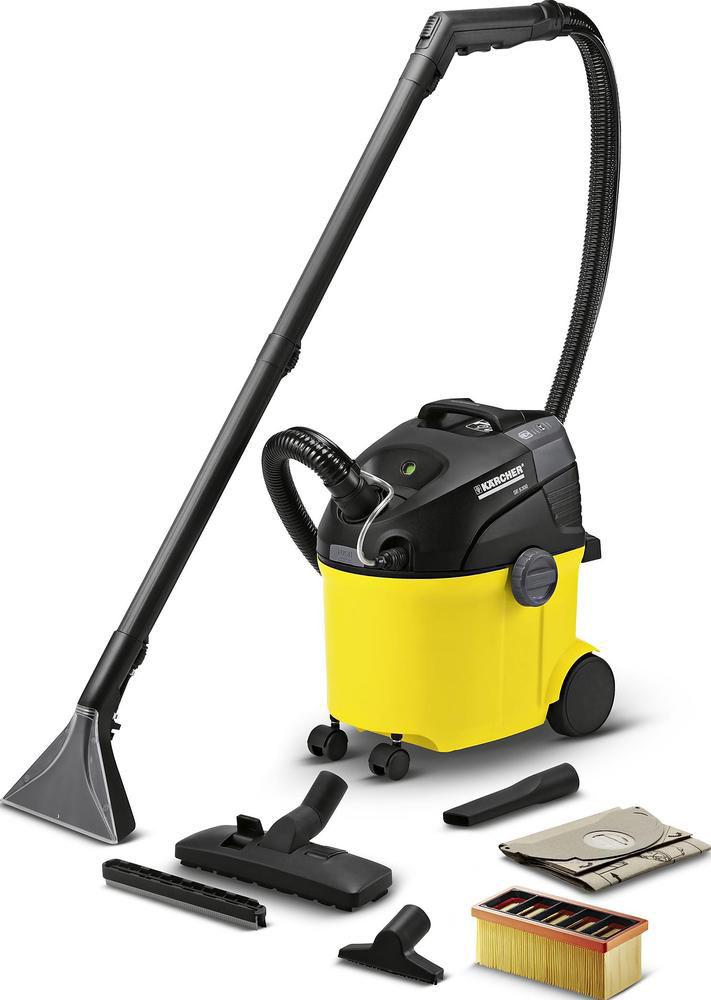 K?rcher пылесос моющий SE5.100. Пылесос очищает ковровые, напольные покрытия, мягкую мебель, матрасы, текстильную обивку стен и автомобильных сидений на всю глубину волокон. Раствор чистящего средства под давлением разбрызгивается на поверхность ковра и сразу же всасывается вместе с отделенной грязью. Тем самым обеспечивается основное устранение жировых и иных загрязнений, а также запахов. С его помощью Вы сможете придать ковровым покрытиям безупречную ��истоту, не прибегая к услугам специалистов.
