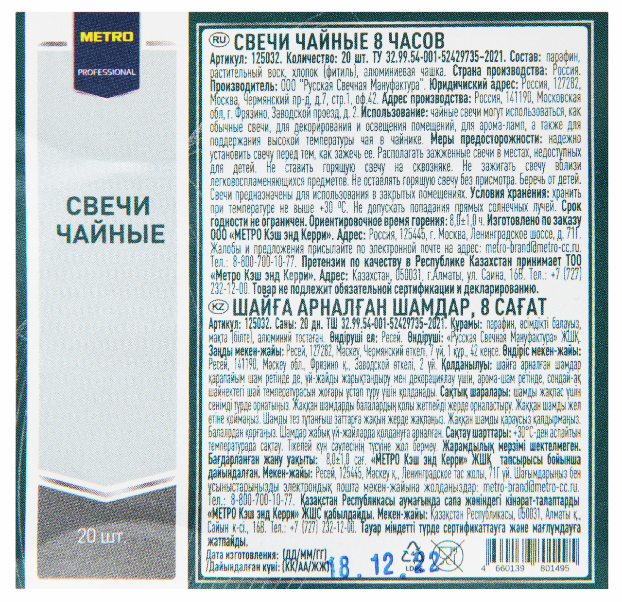 METRO PROFESSIONAL Свеча чайная Классика 8 часов, 20 шт. позволит создать в помещении атмосферу гармонии и умиротворения, наполнит комнату теплом и уютом. Свечи, расставленные в ванной, помогут расслабиться, настроиться на позитивный лад и насладиться минутами релакса. Время горения одной свечи составляет около 8 часов, поэтому даже одной штуки хватит на длительное время. Воск заключен в практичную гильзу и не попадет на покрытие. Свечи равномерно горят и не коптят. В набор входят 20 штук. Их можно использовать в том числе для аромалампы и чтобы поддерживать напиток в чайнике горячим.