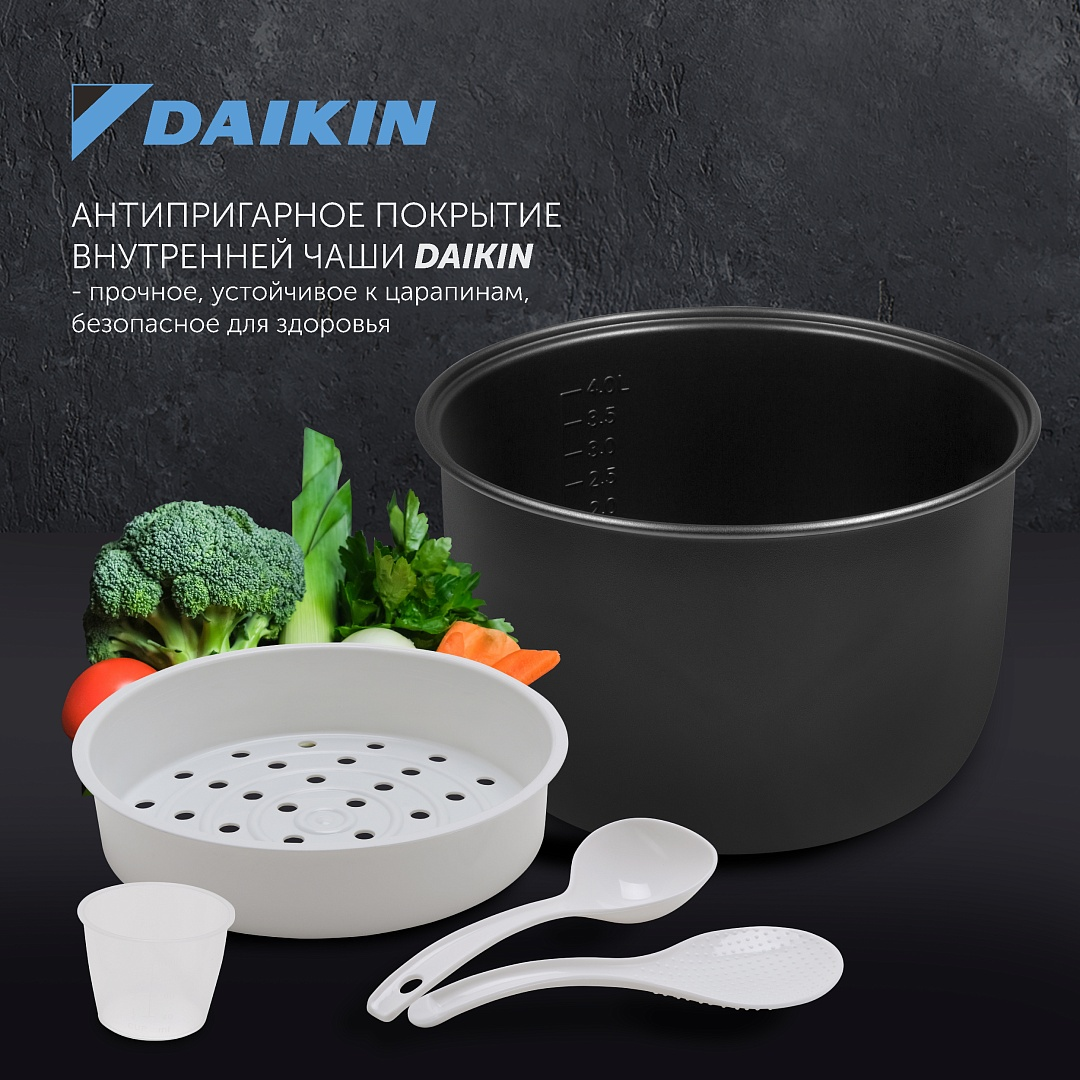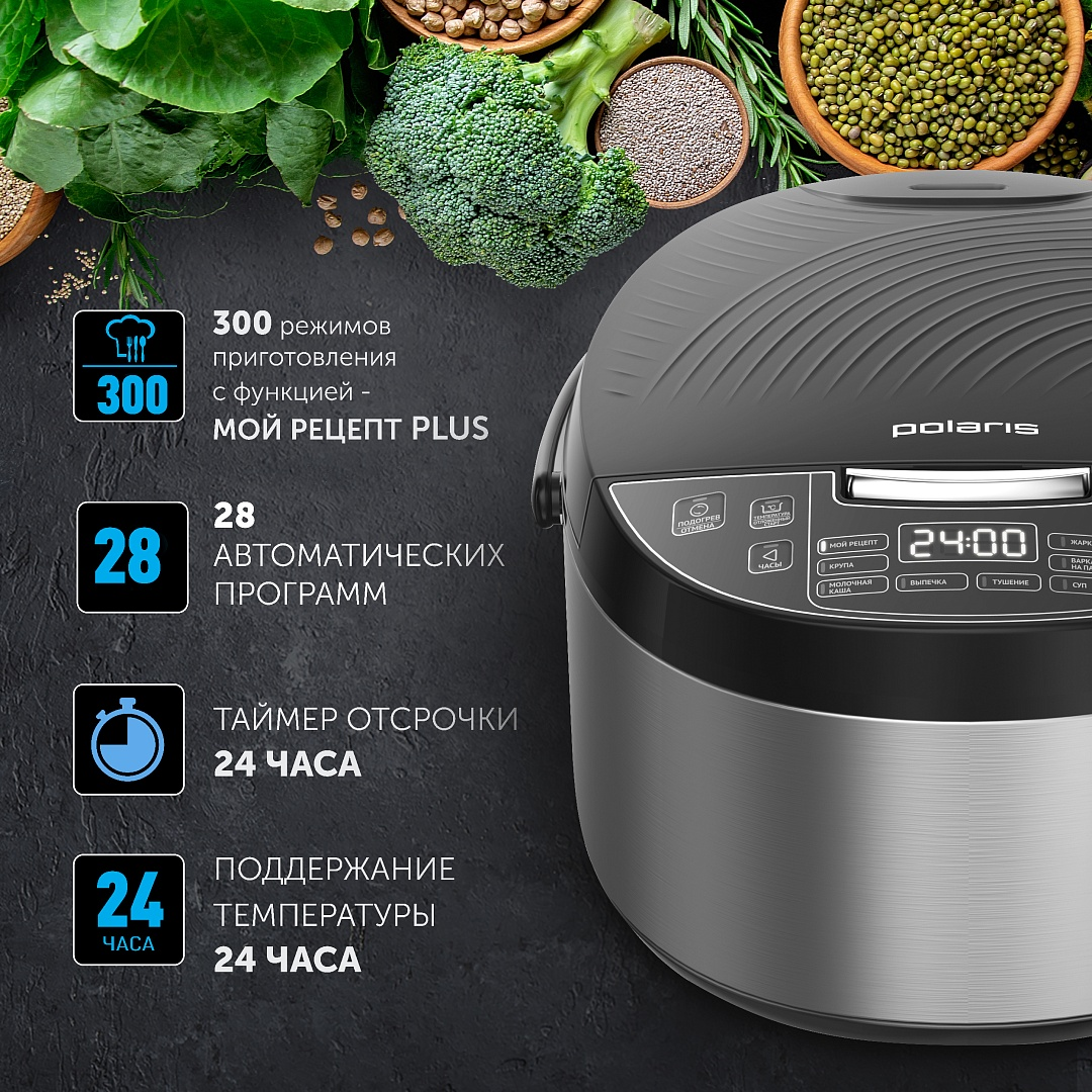 300 режимов приготовления с функцией - Мой рецепт plus.Чаша с антипригарным покрытием Daikin - 5 л.Таймер отсрочки - 24 часа. Режимы работы: Мой рецепт Plus, Крупа, Молочная каша, Выпечка, Суп, Жарка, Варка на пару, Тушение.Многофункциональный дисплей.28 автоматических программ.Поддержание температуры 24 часа.