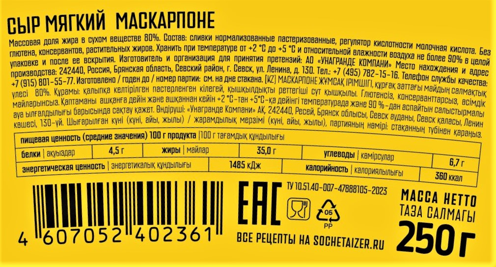 Маскарпоне Pretto, 250 г – это классический сливочный сыр с очень высокой жирностью, обладающий нежнейшим вкусом и воздушной легкой консистенцией. Созданный из натуральных сливок, он будет идеальной основой для приготовления классического итальянского десерта – тирамису. Помимо тортов, маскарпоне отлично сочетается с любой другой выпечкой, а также с пастой, спагетти, запеченными яблоками. Внешне сыр отличается кремовым цветом и напоминает хорошо взбитые сливки с присущим им молочным ароматом. Его мягкий тающий вкус понравится настоящим ценителям итальянской кухни и свежей домашней выпечки.