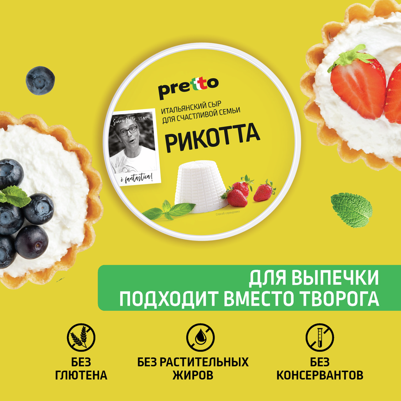 Сыр Pretto Рикотта мягкий 45%, 200г БЗМЖ – это вкусный и кремовый сыр с нежной фасолевой основой. Прекрасно подходит для приготовления различных блюд, а также для нарезки и украшения блюд.