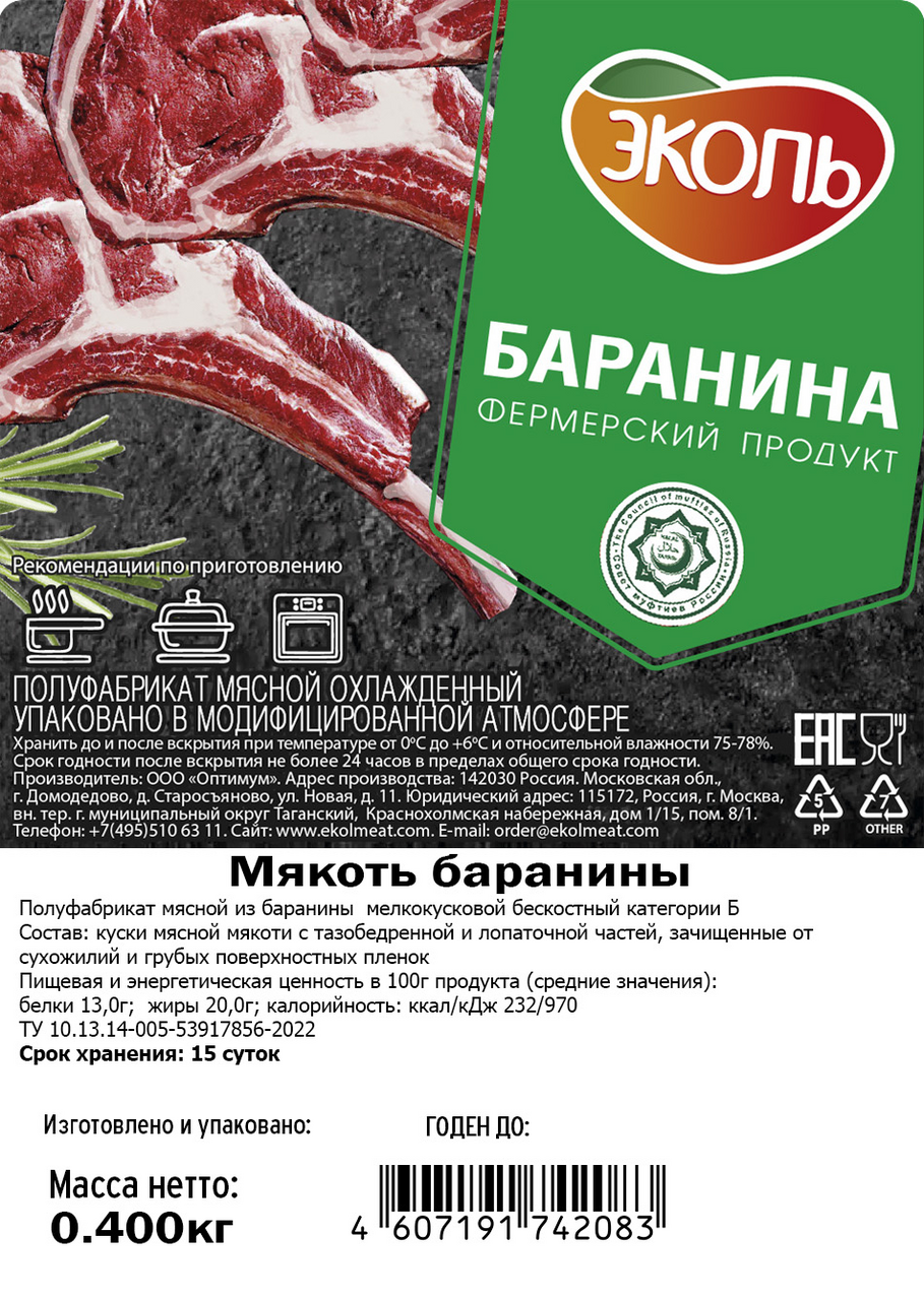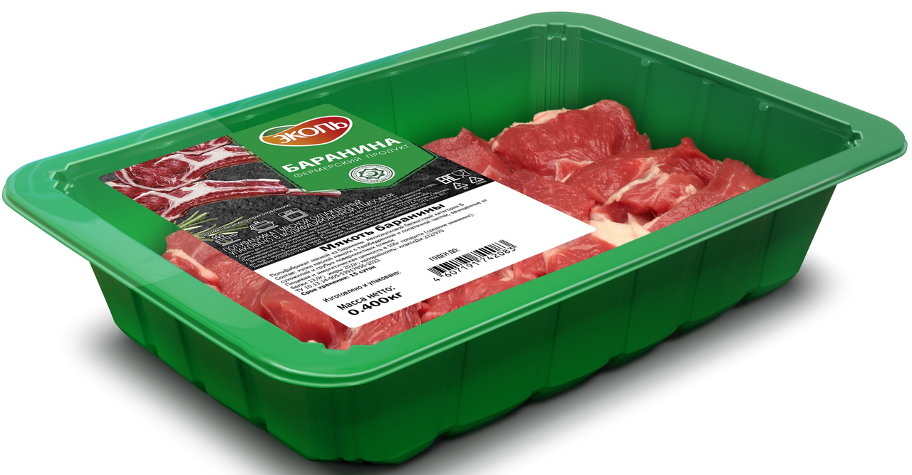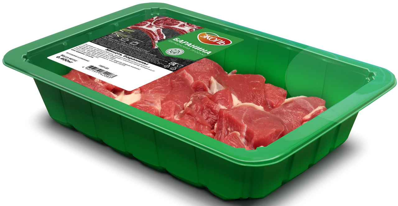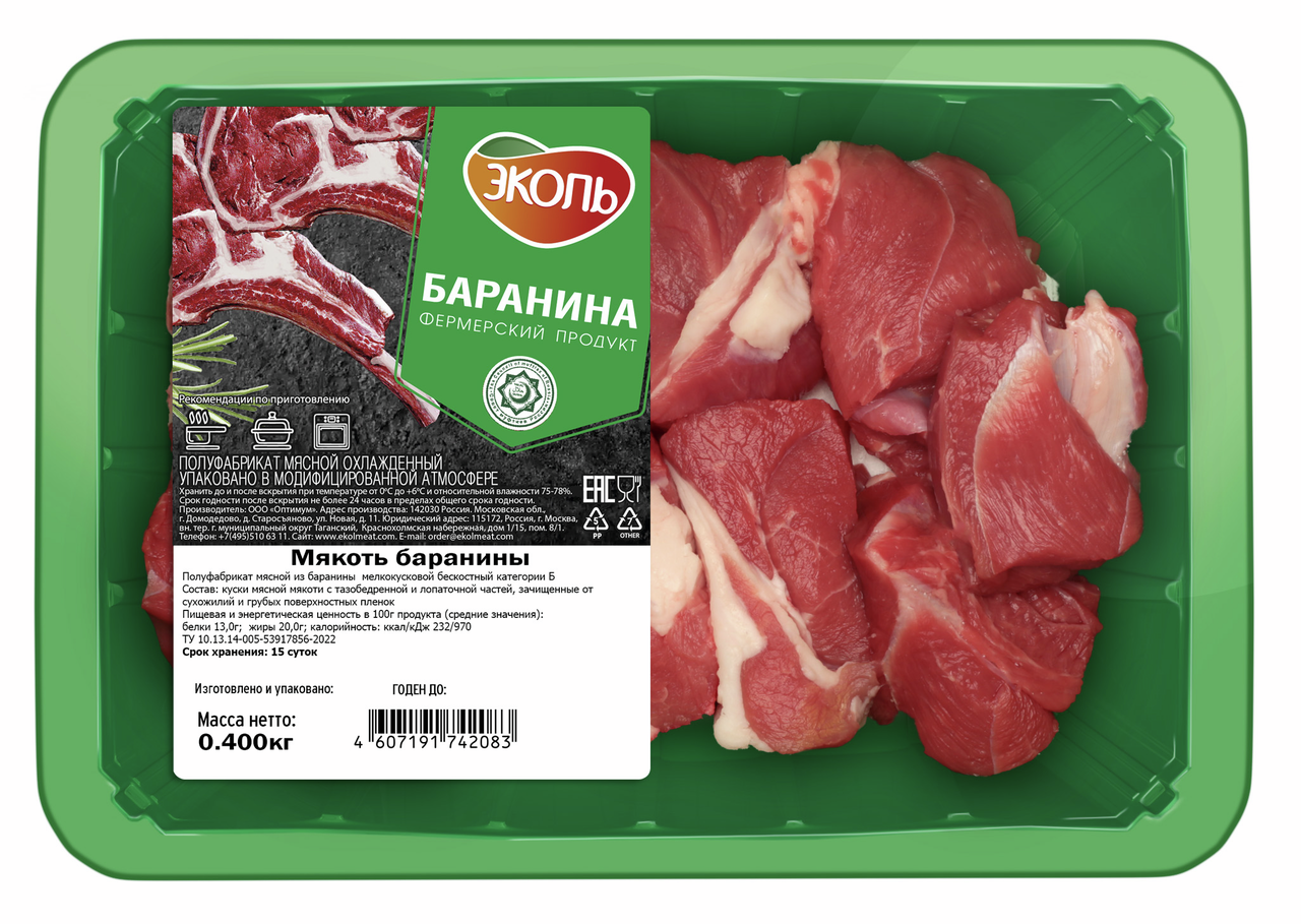 Полуфабрикат мясной из баранины охлажденный, мелкокусковой, бескостный категории Б; Упаковано с применением модифицированной атмосферы.