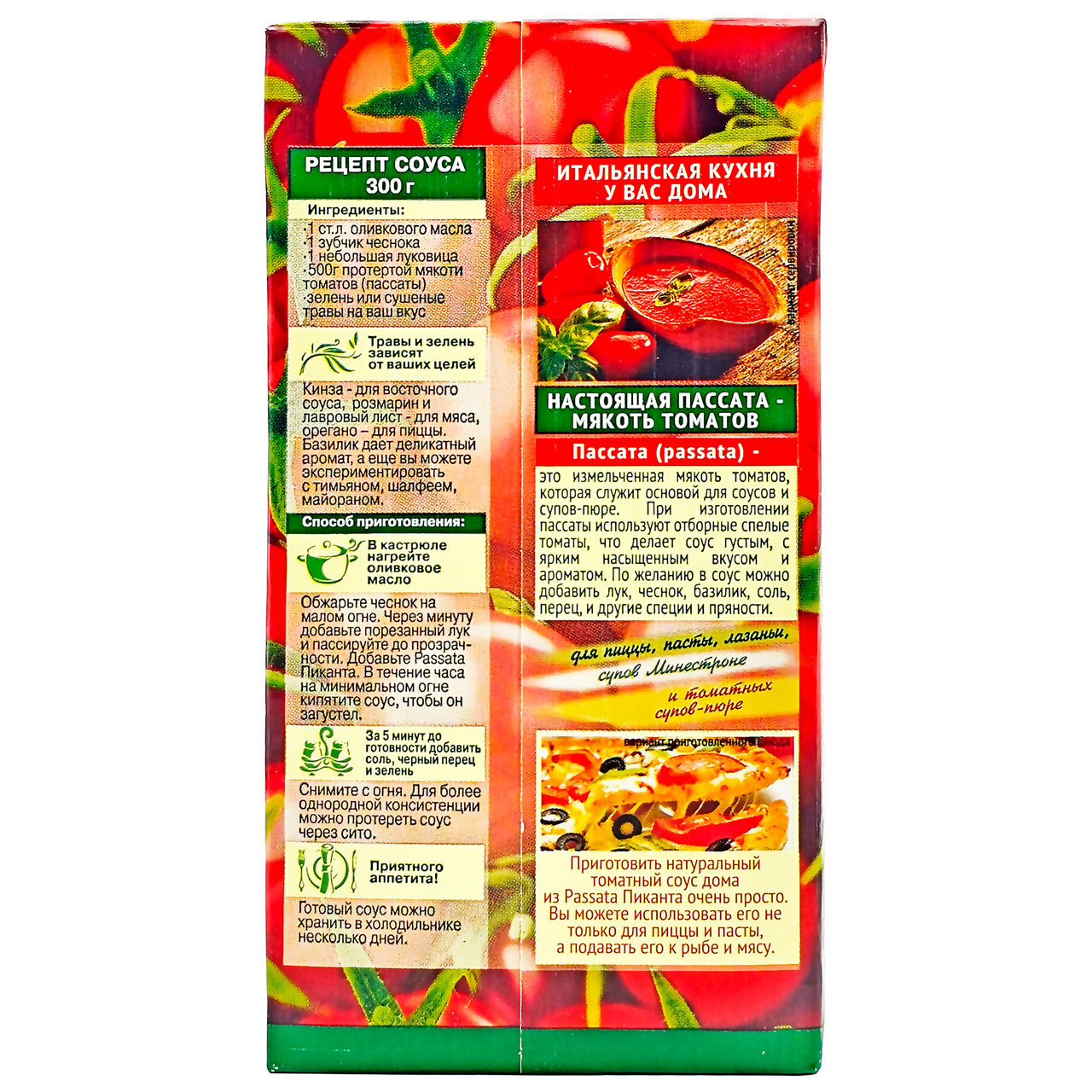 Пассата (Passata) - это измельченная мякоть томатов, которая служит основой для соусов и супов-пюре. При изготовлении пассаты используют отборные спелые томаты. Это делает соус густым, с ярким насыщенным вкусом и ароматом. По желанию в соус можно добавить лук, чеснок, базилик, соль, перец и другие специи и пряности. Идеально подходит для пиццы, пасты, лазаньи, супов Минестроне и томатных супов-пюре. Изготовлена из отборных спелых томатов. По желанию можно добавить лук, чеснок, базилик, соль, перец и другие специи. Идеально подходит для пиццы, пасты, лазаньи, супов и других блюд.