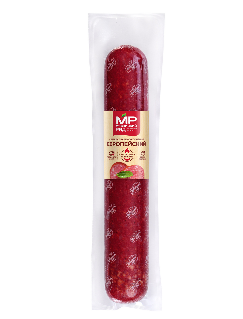 Колбаса Мясницкий ряд Европейский сервелат обладает насыщенным мясным вкусом и ярким ароматом, который достигается благодаря добавлению целого букета специй и пряных трав. Продукт подойдет как для приготовления праздничных нарезок, так и для создания бутербродов, для солянок, мясных салатов и прочих блюд. Колбаса готовится на основе отборной говядины и свинины и не содержит ГМО, а также искусственных и вредных консервантов и ароматизаторов. Современные технологии приготовления и упаковки продлевают срок годности продукта.