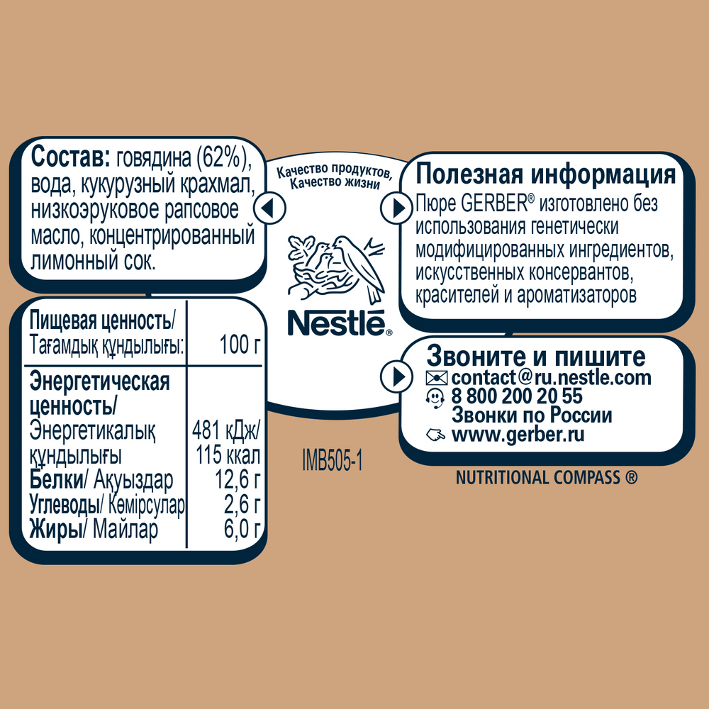 Гомогенизированная однородная текстура пюре способствует комфортному переходу ребенка на твердую пищу.Состав: мясо говядины (62%), вода (35%), кукурузный крахмал, низкоэруковое рапсовое масло, концентрированный лимонный сок.Рекомендации по приготовлению/использованию: Идеальной пищей для грудного ребенка является молоко матери. Продолжайте грудное вскармливание как можно дольше после введения прикорма. Необходима консультация специалиста.Пищевая ценность: Белки 12,6г, Жиры 6г, Углеводы 2,6г.Энергетическая ценность (Ккал): 115ккалГотово к употреблению.Условия хранения: 6-30C. Открытую банку хранить в холодильнике не более 24 часов.Не использовать продукт, если при открывании не произошло щелчка. Начните кормление с 1 чайной ложки, постепенно увеличивая объем. Срок годности: 18 месяцев