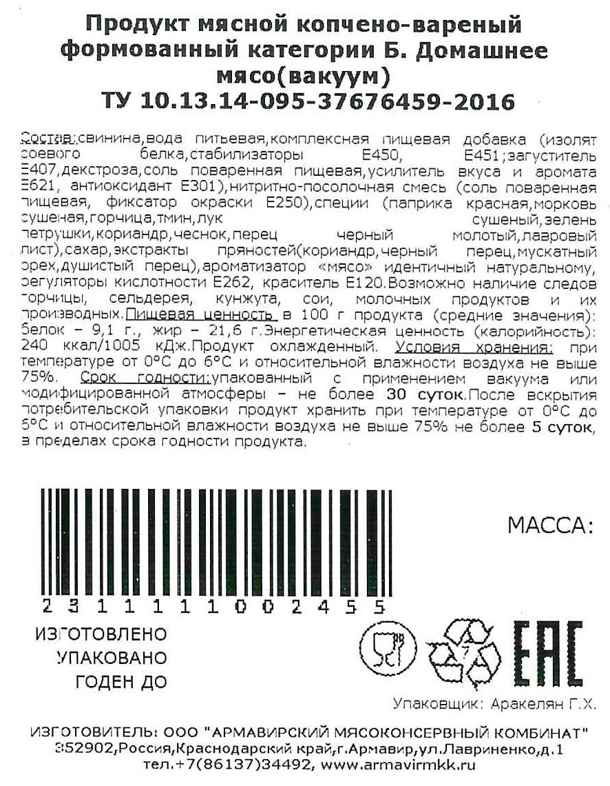Мясо домашнее Армавирский МК копчено-вареное, ~400г