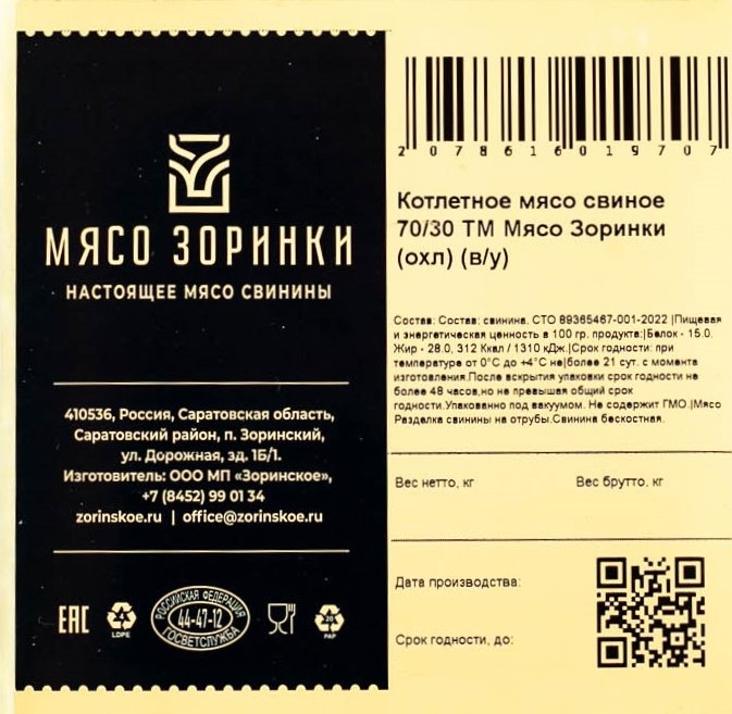 Мясо котлетное свиное Мясо Зоринки охлажденное, ~2кг