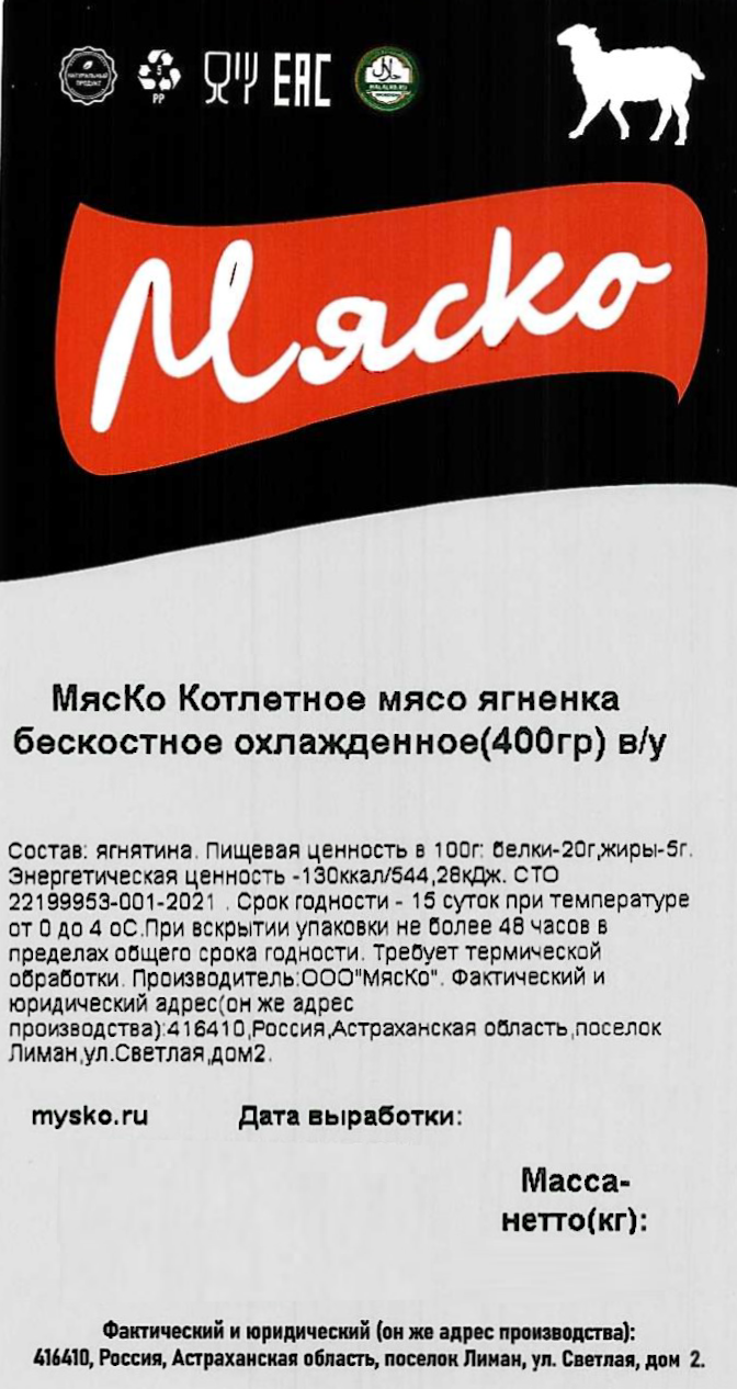 Мясо котлетное ягненка Мяско Халяль бескостное охлажденное, ~400г